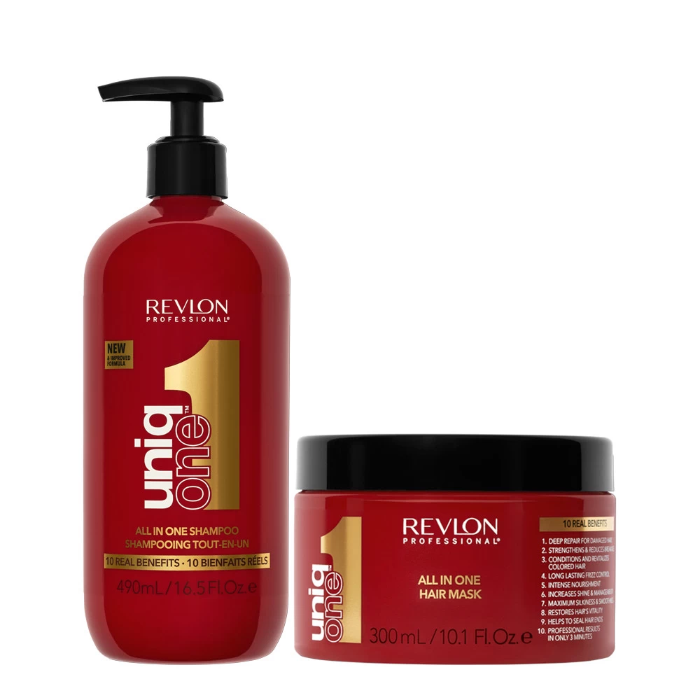 Duo Shampooing Et Masque Uniq One Revlon : Shampooing 490ml et Masque 300ml Tout-En-Un pour tous les types de cheveux.