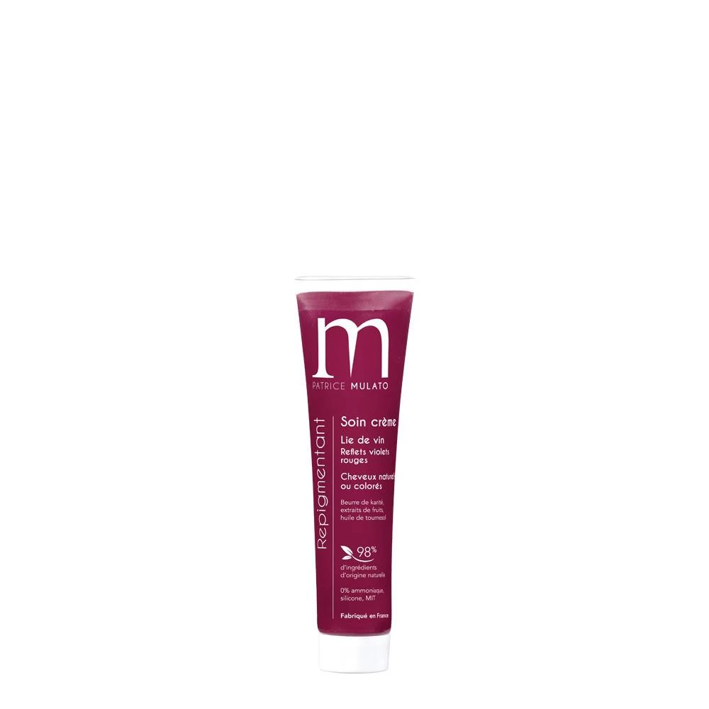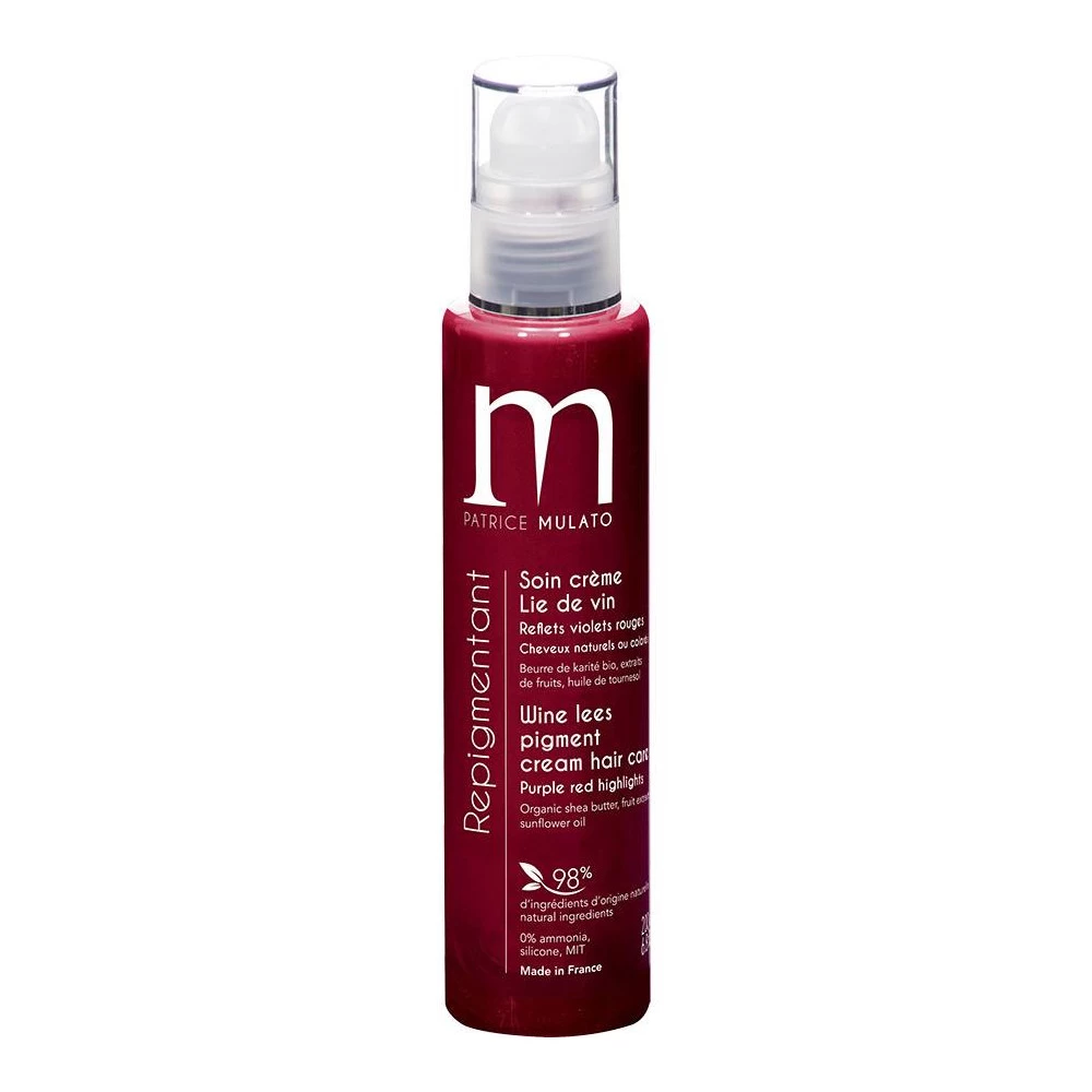 Soin Repigmentant Lie De Vin Patrice Mulato : soin crème lie de vin pour cheveux naturels ou colorés, reflets violets rouges. Composé de beurre de Karité bio, aux extraits de fruit et huile de tournesol. 98% d’ingrédients d’origine naturelle, 0% d’ammoniaque, eau oxygénée, silicone et paraben. Fabriqué en France.