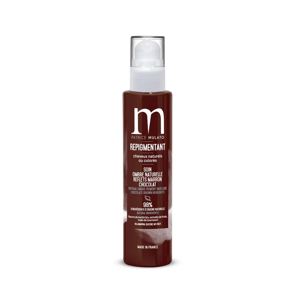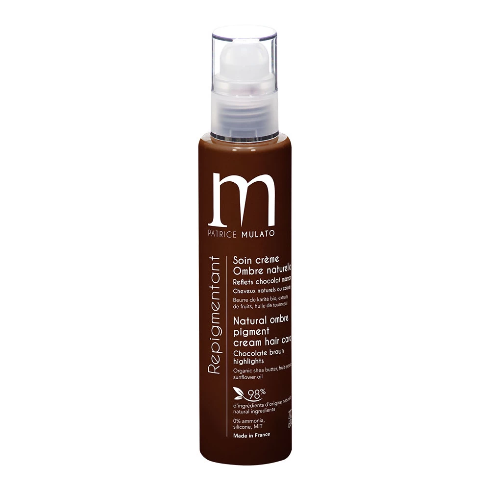Soin Repigmentant Ombre Naturelle Patrice Mulato : soin crème ombre naturelle, reflets chocolat marron pour cheveux naturels ou colorés. Composé de beurre de Karité bio, aux extraits de fruit et huile de tournesol. 98% d’ingrédients d’origine naturelle, 0% d’ammoniaque, eau oxygénée, solicone et paraben. Fabriqué en France.