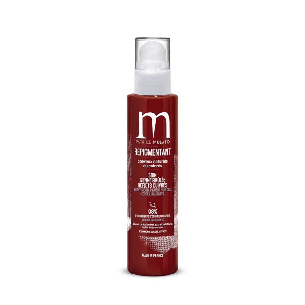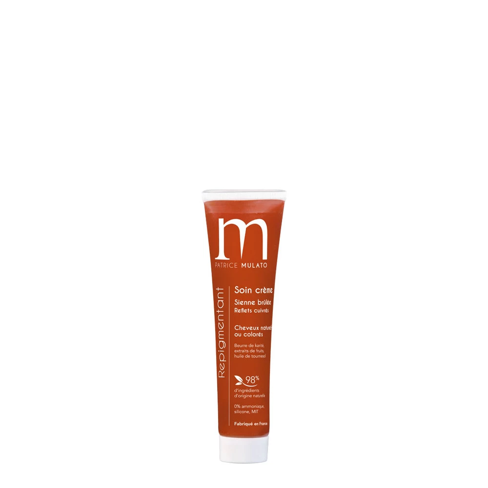 Soin Repigmentant Sienne Brûlée Patrice Mulato : soin crème sienne brûlée, reflets cuivrés pour cheveux naturels ou colorés. Composé de beurre de Karité bio, aux extraits de fruit et huile de tournesol. 98% d’ingrédients d’origine naturelle, 0% d’ammoniaque, eau oxygénée, solicone et paraben. Fabriqué en France.